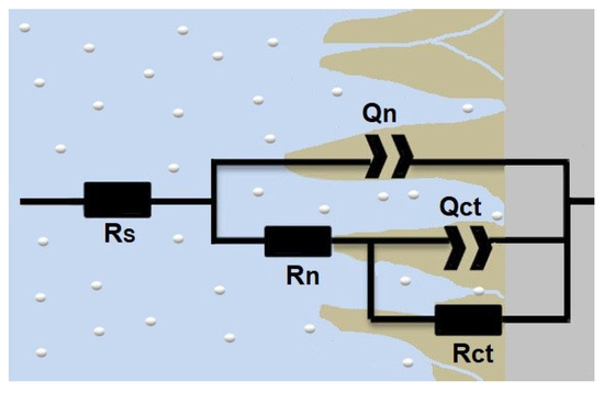 In order to further study the electrochemical behavior of the of AS steel 316L samples with heat-untreated and plasma-nitrided surfaces, equivalent circuits were used to simulate the EIS data. The layer shown in Figure 12 is porous (different thickness) with electrochemical reactions occurring only on the exposed electrode surface at the end of the pore. The equivalent circuit with two constant models corresponding to the scheme of the coated electrode is presented in Figure 13.