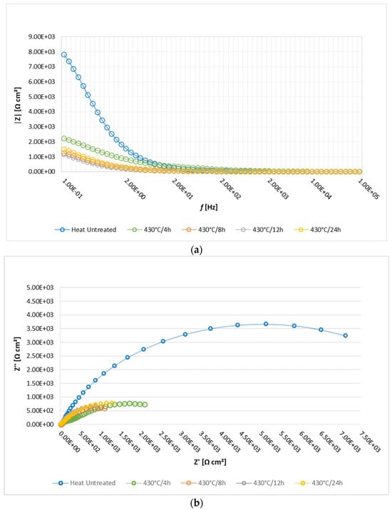 The Bode and Nyquist diagrams of the heat-untreated and nitrided AS steel samples with the corresponding equivalent circuit model applied for the simulation of EIS results are presented in Figure 14a,b. The response of the EIS spectrum at higher, medium, and lower frequencies is shown in Figure 15.