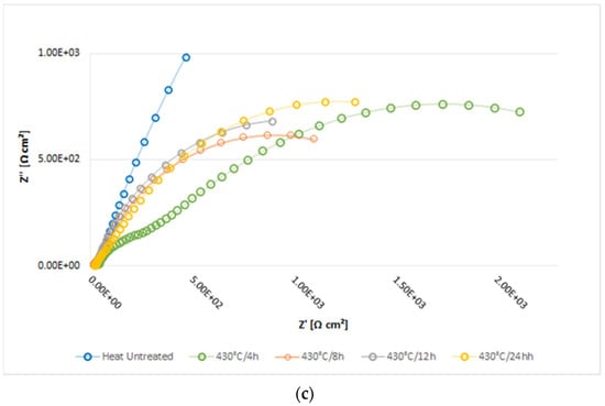 The results of EIS tests conducted on heat-untreated and nitrided AS steel AISI 316L: (a) Bode plot; (b) Nyquist plot; (c) detail of the Nyquist plot for low values of Z’.