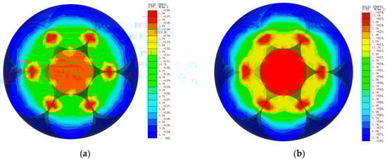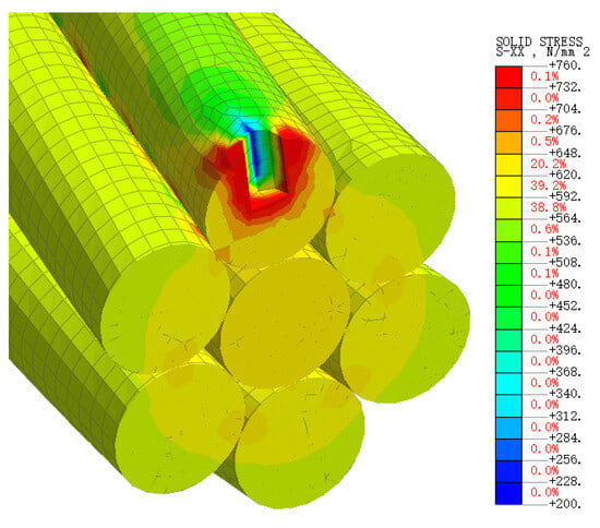In order to verify the reasonableness of using Midas FEA NX to simulate the elastic–plastic phase of the strand, pressure loads of 100 Mpa, 200 Mpa, 300 Mpa, 400 Mpa, 500 Mpa, and 600 Mpa were applied successively to the surface of the 3D cell at the loading end of the strand. Table 2 shows calculations of average stresses on the half-twist cross-sections of the outer and middle wires, and Figure 3 shows the stress cloud of the seven-wire cross-sections subdivided by the grid under different tensile stresses. Comparing the calculated results for the average stresses on the half-twisted sections of the outer and middle wires with the theoretical calculations of Feyrer [26], it can be seen that the stresses on the middle wire are greater than those on the outer wire in both cases. Compared with the theoretical calculations of Feyrer, the maximum error for the middle wire is 2.2%, and that for the outer wire is 0.8%. The stress maps calculated for the present study are similar to those previously reported in the literature [27,28,29], so the simulation results may be said to be basically consistent. These results show that the finite element model described in this paper can effectively simulate the stress state of the strand cross-section; it may also be concluded that the model is able to simulate the stress-release law.