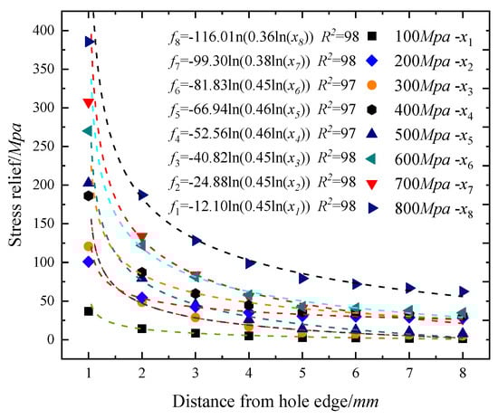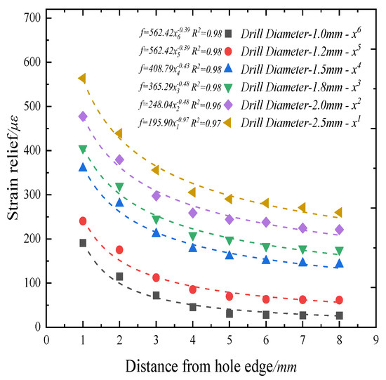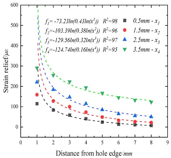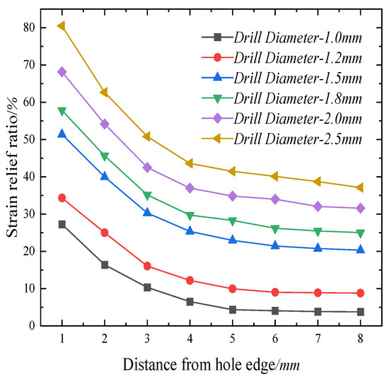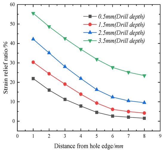 The depth of the drilled hole was then set to 0.5 mm, 1.5 mm, 2.5 mm, and 3.5 mm, successively. Tension stress was 550 Mpa, the drilled hole diameter was 1.5 mm, and settings for the remaining static–dynamic parameters remained unchanged. The Bradley curve fitting method in Origin is shown in Figure 10. It can be seen that the correlation coefficients of the fitted curves are all greater than or equal to 0.95. Analysis of Figure 10 reveals the following: (1) the value of the depth of the borehole is positively correlated with the strain release; (2) the greater the depth of the borehole, the more obvious the effect of the strain release; (3) with increases in distance between the edges of the holes, the effect of the strain release decreases, and the trend of the reduction gradually declines; (4) the amount of stress release in different borehole depths is positively correlated with the size of the hole. Strain release at different drilling depths exhibits a similar trend with respect to changes in hole–edge distance, so that when the hole–edge distance is in a range of 1–8 mm, the strain release is positively related to the drilling depth. Analysis of Figure 11 reveals the following: (1) when the hole–edge distance is in a range of 1–6 mm, the stress-release rate (the ratio of pre-drilling stress and post-drilling stress release at the same node, multiplied by 100%) at a 0.5–3.5 mm drilling depth is in a range of 2.6%–48.6%; (2) under different drilling depths, the trend of the strain-release rate is basically the same as when the hole–edge distance declines, so that the greater the drilling depth, the higher the strain-release rate. At drilling depths of 3.5 mm, 2.5 mm, and 1.5 mm, with a hole–edge distance of 1 mm, the strain release is 24.4%, 35.1%, and 48.6%, respectively. We may say, then, that at drilling depths of 0.5–3.5 mm, with a constant hole–edge distance, strain release is positively correlated with drilling depth. When the drilling depth reaches a level of 2.5–3.5 mm, the amount of stress release increases significantly, indicating that, at such a level, the plastic strain of the steel wire grows significantly, so that a drilling depth of 2.5–3.5 mm may be considered most appropriate.
