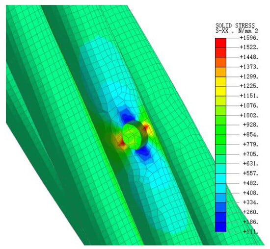 The bearing capacity of the strand will be greatly reduced after any breakage of the wire [31]. In order to avoid stress concentration or any other factors that might cause fracturing of the drilled steel wire, a 1000 Mpa axial stress load was applied, using a 1.5 mm drill bit, to a depth of 2.5 mm, so that the stress map was located near the drilled hole cross-section, as shown in Figure 12. It can be seen from Figure 12 that the maximum stress at the edge of the drilled hole is 1691 Mpa, and the effect of stress concentration is mainly at the drilled hole cross-section; this effect decreases in the direction of the depth of the drill bit, but is less obvious on the strain measurement surface, and may be neglected under the test ranging. These results show that a drilling depth of 2.5 mm is most effective; this results in the least damage to the bearing capacity of the strand.
