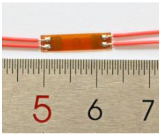 To fulfill the requirements of the test, a set of steel strand tensioning platforms was constructed indoors, as shown in Figure 13. The tensioning platform was 3 m long and was mainly composed of a manually separated hollow hydraulic jack, a clip anchorage, a reaction frame, a pad plate, a pressure sensor, and other parts. The instruments and equipment used in this test included a manually separated hollow hydraulic jack, a DH3819 wireless static strain collector produced by China Jiangsu Donghua Testing Technology Co. (Taizhou, China), customized resistance strain gauges, a JMZX-3102AT pressure transducer produced by China Changsha Golden Code Inspection Co. (Changsha, China), and tools such as an electric drill. Due to the stranded steel wire cross-section being small in size with a curved surface, there was a risk that the strain gauge might be damaged in the drilling process, so that release-strain data would not be collected. For this reason, after a variety of comparative analyses of strain gauges and negotiation with the strain gauge manufacturer, we chose to use unidirectional two-piece customized resistance strain gauges (model BFH120-1GB-7.0-D150) with a base length of 14 mm and a base span of 1.5 mm. In line with the manufacturer’s guidelines, we used customized resistance strain gauges to collect the strain gauges. Using factory calibration, we set the sensitivity coefficient of the strain gauge to 2.0, and the resistance value to 120 Ω. A photographic image of the strain gauge is shown in Figure 14. All strands used in this test were from the same manufacturer, and were taken from a single batch, using the same strand for prestressed concrete, with all strands cut to the required length by using a cutting machine for the test. The measured basic parameters of the steel strand are shown in Table 3.