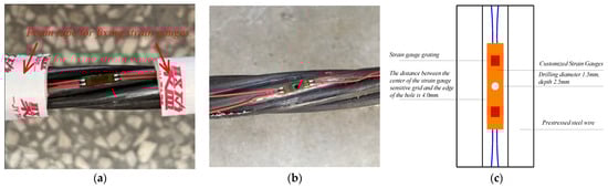 Schematic diagram of stranded wire drilling test. (a) Before drilling of stranded wire. (b) After drilling of stranded wire. (c) Strain gauge paste example.