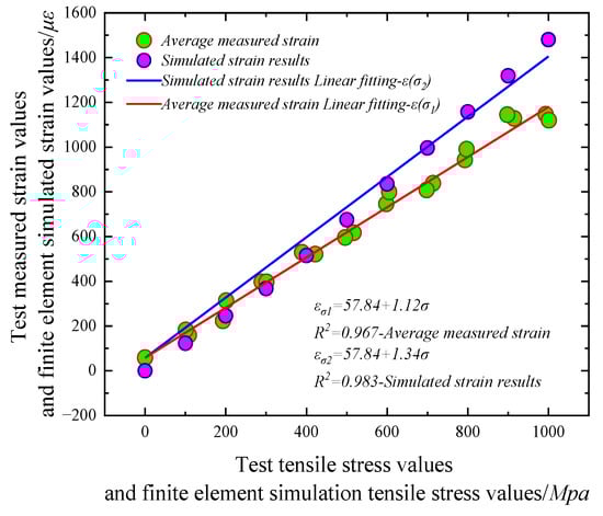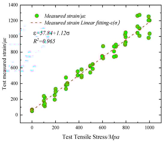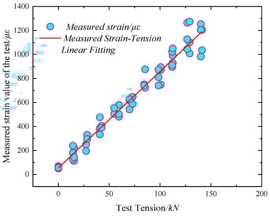 As can be seen in Table 4, the percentage of valid measurement data was 88%. This was because of the mechanical disturbances caused by the use of a hand-held electric drill, and the difficulties arising from drilling a curved surface, as mentioned above. Table 4 also shows that the strand was drilled on the outer steel wire under a test procedure which involved first tensioning the strand and then attaching strain gauges. Strain values at the edge of the hole were then measured using customized strain gauges. The relationship between the test tensile-force value and the measured hole–edge strain value is plotted in Figure 16, and the linear fitting of the tensile stress and the measured strain obtained using Origin is shown in Figure 17. The linear fitting of the tension stress to the measured mean strain was also obtained using Origin, and is shown in Figure 18. From an analysis of Figure 16, Figure 17 and Figure 18, the following may be concluded: (1) the strand tension force, tension stress and measured strain are linearly and positively correlated, thus verifying the reasonableness of the theory of drilled hole releasing stress proposed in this paper; (2) from the values for strand tension, strand average tensile stress, and the measured strain obtained using Formula (9), the correlation coefficients R2 = 0.965 and R2 = 0.967 may be calculated; (3) with increases in the applied force, the strain measured value of the data collected gradually disperses; (4) as shown in Figure 18, using measured values and the Midas FEA NX 2022 (v1.1) software simulation, the two sets of data-fitting results show that tension stress loads and strain values are positively proportional to the results of the limiting element analysis. Results that are comparable with the measured data include the depth of the borehole and the measured strain release under low-stress conditions.