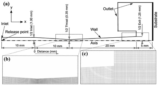 A commercially available CFD code, Fluent (17.0 Fluent Inc., New York, NY, USA), was used to predict steady gas flow and analyze particle acceleration behavior during VCS. Thanks to the axisymmetric nozzle used in this study, a two-dimensional axisymmetric model, as shown in Figure 2a, was established to save computational time [28,29]. The dimension of the nozzle in this simulation was consistent with the experimental nozzle used. The substrate was placed 5 mm away from the nozzle exit. The computational domain was meshed by structured grids with 23,000 nodes to achieve a grid-independent solution, as shown in Figure 2b,c. The gas inlet was chosen as the pressure inlet with a pressure value of 0.05 MPa and four temperature values of 293 K, 423 K, 523 K, and 623 K, while the outlet pressure and outlet temperature were constant and equal to 300 Pa and 300 K. The reference atmosphere was at a pressure of 0 Pa, and the heat transfer process between the nozzle wall and the gas flow was not considered.