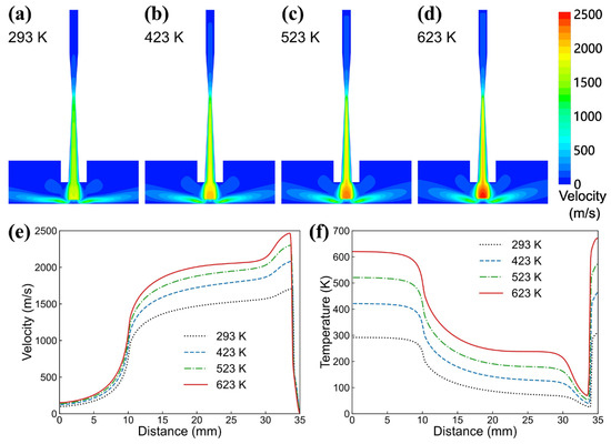 CFD gas flow velocity results with different inlet gas temperatures of (a) 293 K, (b) 423 K, (c) 523 K, and (d) 623 K. And changes of (e) velocity and (f) temperature of flow along the nozzle centerline.