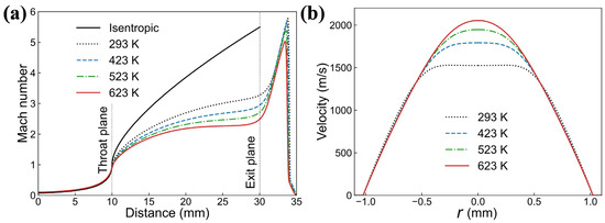 The gas flow velocity and gas temperature demonstrate a conspicuous upward trend as the inlet gas temperature rises. This trend aligns with the outcomes predicted by isentropic theory (see Table 2). As the inlet gas temperature elevates from 293 K to 623 K, the simulated gas flow velocity at the nozzle exit’s center surges from 1572 m/s to 2136 m/s. Due to the influence of viscous effects in the flow, the simulated gas flow velocities in all four cases are somewhat lower than those predicted by the isentropic theory. Consequently, as illustrated in Figure 4a, the Mach numbers along the nozzle’s central axis in these four cases fall short of the Mach numbers calculated using the isentropic theory.
