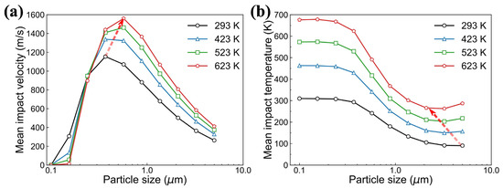 (a) Particle mean impact velocity and (b) mean impact temperature for different particle diameters at gas temperatures from 293 K to 623 K. (The arrows represent the variation in particle size corresponding to the lowest impact temperature.)