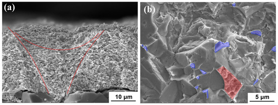 The cross-sectional view of one of these cone-shaped pits, as shown in Figure 11a, confirms that it originates from a pit on the substrate’s surface. Furthermore, the pit diameter undergoes more pronounced changes with the thickness of the copper films, as depicted in Figure 10. As the pit diameter increases, the pit walls become flatter, ultimately resulting in the gradual disappearance of these larger pits. Consequently, observing large pits on the surface of copper films with a thickness exceeding 40 μm becomes challenging. Figure 11b displays the SEM image of the peeled surface of the copper film from the alumina substrate. This image reveals that small pits on the substrate surface can be adequately filled by an individual or a limited number of copper particles (highlighted in blue). However, for slightly larger pits, multiple particles are required for filling (highlighted in red). Furthermore, larger pits, such as those within the red circle in Figure 9a and the pits in Figure 11a, result in the persistence and evolution of cone-shape pits. Mechanical interlocking is the primary factor contributing to the adhesion of metal coatings to ceramic substrates. The presence of certain irregularities on the substrate surface further enhances the substrate’s ability to achieve a robust bond with the copper film [17,44,45].