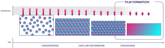 Schematic of drying processes and film formation for ink. In the first phase, particles, which, in our case, are latex particles, are dispersing and diffusing in a mixture of water and glycerol. After some time, the volatile phase evaporates, increasing the volume fraction of the scattering latex particles. The rate of evaporation decreases with time as the volume fraction increases. At a high volume fraction such that the particles nearly touch, internal capillary forces and deformation predominate and can cause particle deformation. Depending on the particular latex particles, coalescence and film formation can then occur if the latex has a sufficiently low glass transition temperature.