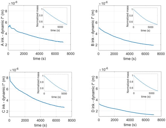 When a liquid dispersion film or droplet dries, concomitant physical processes affect the scattering properties of the material, i.e., , to an unknown magnitude. Only when remains smaller than the physical size of the coating or droplet can we consider the light as performing random walk thorough the sample, and we can apply the diffusion approximation, leading to accurate interpretation for the autocorrelation functions in DWS or LSI experiments. Given the difficulty of measuring changes in for individual inkjet-printed micrometer/picoliter droplets, here, is measured for an ink film of a known thickness of L = 0.150 mm, with this initial height of the sample being achieved through the use of a doctor blade. In a separate measurement, the weight of the sample is recorded with time for each of the four inks at the same ambient conditions as the measurements. Recorded data are normalized and fit using a Gaussian biexponential model, which best describes the mass decay. Assuming the same decay for the sample height, is computed as the film dries. Crucially, this change in thickness is taken into account when calculating through Equation (1). The mass loss is shown in the inset in Figure 4: the normalized mass (%) as a function of time for the first 5000 s after film preparation appears to follow a -linear drying rate, which reduces over time. The full picture of the mass loss for the four inks at longer times is reported in Appendix A, Figure A1, where after approximately 10 s, the normalized mass stabilizes to approximately 40% of the initial value for all the ink dispersions under investigation. Once is known, can be calculated from the dynamic transmitted light intensity with a time resolution of a millisecond, as shown in Figure 4 for four model inks averaged over repeats.