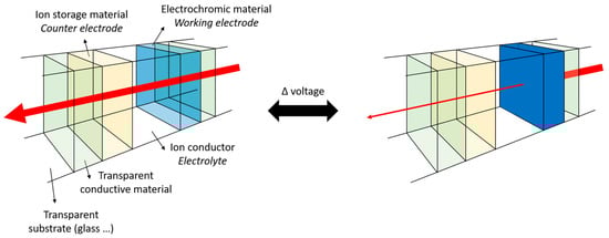 Traditional architecture of electrochromic EC devices, responding to applied voltage. Adapted from [9].