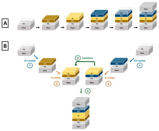 Comparison of EC devices’ fabrication approaches: (A) multilayer stacking vs. (B) lamination. TCL stands for “transparent conducting layer”, EC1 and EC2 stand for “electrochromic layer 1 or 2”, and EL stands for “electrolyte layer”.