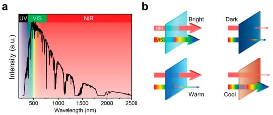 Representation of the solar radiation spectrum (a) and of the four filtration modes in dual-band EC systems (b). Reproduced with permission from [33], Copyright 2023, Wiley.
