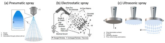 Figure 5. Three modes of spray atomization methods: (a) pneumatic, (b) electrostatic, and (c) ultrasonic. Adapted from [47] and reproduced with permission from [57]. Copyright 2023, Elsevier. - Electrostatic spray (Figure 5b), in which the precursor fluid is first charged with static electricity by applying a relatively high voltage within the spray nozzle (up to several thousands of V) and then changed into a droplet mist through electrostatic repulsion; the spray mist is then specifically attracted to the target surface standing on a grounded stage, therefore reducing the overspray quantity. Thanks to the strong electrical field in play, electrospray systems can be used with solutions and suspensions of quite high viscosities as well as with pastes and slurries.