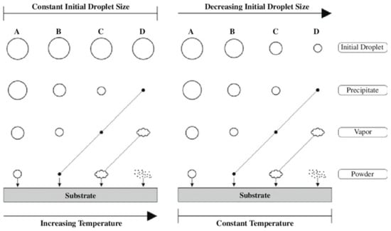 Viguié-Spitz and Siefert models, respectively, describing spray pyrolysis as a function of the substrate temperature (increasing from A to D) and constant initial droplet size (left), and the constant temperature and variable droplet size (decreasing from A to D) (right). Reproduced with permission from [58]. Copyright 2023, Springer.