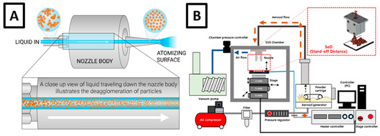 Spray deposition of (A) liquid suspensions (being ultrasonically deagglomerated here) and (B) dry powders of nanoparticles (NPDS). Reproduced with permission from [48] (Copyright 2023, Sono-Tek) and from [64] (Copyright 2023, Springer).