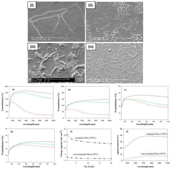 WO3 thin films deposited by a surfactant-assisted ultrasonic spray pyrolysis: (i–iv) SEM micrographs and (a–d) UV-VIS spectra (green curve: as-deposited state; black curve: bleached state; red curve: colored state) of (i,a) templated films deposited at 100 °C and post-treated at 350 °C for 2 h; (ii,b) templated films deposited at 190 °C; (iii,c) non-templated films deposited at 100 °C and post-treated at 350 °C for 2 h; (iv,d) non-templated films deposited at 190 °C; (e) charge capacity evolution with the cycling of the templated and non-templated films (190 °C); (f) optical contrast after the cycling of the templated and non-templated films (190 °C) as a function of the wavelength. Reproduced with permission from [104]. Copyright 2023, Elsevier.