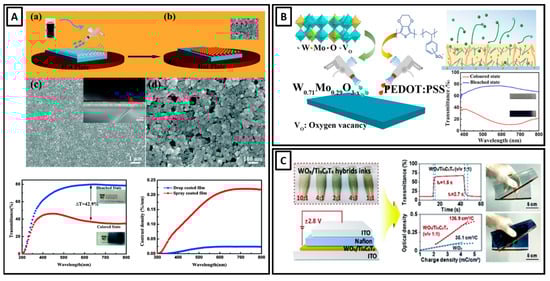 (A) Spray deposition (a) and drying (b) of W0.71Mo0.29O3 films, with low- (c) and high-magnification (d) SEM images, UV-VIS transmittance spectra in colored and bleached states, and a contrast density of spray-coated and drop-casted films—reproduced with permission from [107] (Copyright 2023, RSC); (B) W0.71Mo0.29O3/PEDOT:PSS electrodes prepared by layer-by-layer spray deposition and consecutive spectro-electrochemical measurements—reproduced with permission from [109] (Copyright 2023, ACS); (C) EC devices produced from WO3/Ti3C2Tx MXene hybrid inks and consecutive spectro-electrochemical measurements—reproduced with permission from [113] (Copyright 2023, RSC).