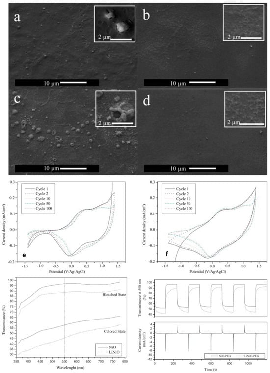 Top: scanning electron micrographs of (a) NiO, (b) NiO–PEG, (c) LiNiO, and (d) LiNiO–PEG thin films. Middle: cyclic voltammetry of (e) NiO–PEG and (f) LiNiO–PEG films. Bottom-left: UV–visible spectra of NiO–PEG and LiNiO–PEG thin films, both on their bleached and colored states. Bottom-right: spectroelectrochemical analysis (550 nm, chronoamperometry) of NiO–PEG and LiNiO–PEG films. Reproduced with permission from [148]. Copyright 2023, Elsevier.