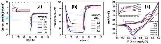Chronoamperometry (a), in situ transmittance (b), and cyclic voltammetry curves (c) of NiO films containing different vol% values of MWCNTs. Reproduced with permission from [151]. Copyright 2023, Elsevier.