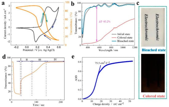 Electrochromic characteristics of NiO NPs-based thin films: (a) CV curve at 20 mV s–1 (with green and blue arrows showing the oxidative and reducing waves, respectively) and in situ dynamic transmittance spectrum at 550 nm; (b) transmittance spectra in three optical states: the initial, coloration at +0.6 V, and bleaching at −0.2 V; (c) digital photographs in bleached and colored states; (d) in situ dynamic transmittance spectrum by coloring (30 s) and bleaching (180 s) at 550 nm; (e) optical density with a changed charge density at 550 nm. Reproduced with permission from [153]. Copyright 2023, ACS.