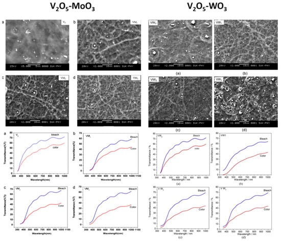 SEM micrographs and optical spectra of V2O5 thin films with various MoO3 (left; reproduced with permission from [164]; copyright 2023, Elsevier) or WO3 (right; reproduced with permission from [166]; copyright 2023, Elsevier) contents: (a) 0% (V0/VW0), (b) 5% (VM1/VW1), (c) 10% (VM2/VW2), and (d) 15% (VM3/VW3).