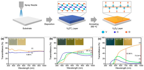 Spray-based fabrication of EC devices based on V2CTx-derived 2D V2O5 nanosheets. Transmittance spectra at (i) colored (−1.2 V), (ii) intermediate (+1.0 V), and (iii) bleached (+1.9 V) states of (a) V2O5 powder, (b) accordion-structured, and (c) 2D V2O5 nanosheet-based ECDs. Reproduced with permission from [186]. Copyright 2023, Elsevier.