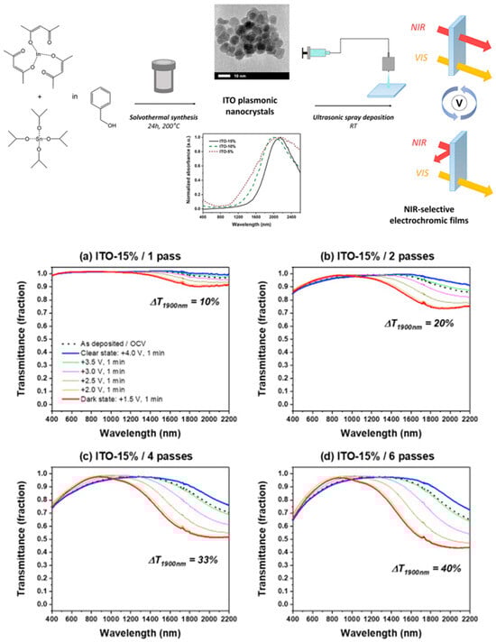 Solvothermally-synthesized ITO NCs with 5, 10, and 15% Sn doping (TEM, UV–VIS–NIR) spray-deposited as NIR EC coatings onto glass. Transmission spectra of ITO NCs (15% Sn doping) layers obtained from: (a) one pass, (b) two passes, (c) four passes and (d) six passes of the spray nozzle. Reproduced with permission from [202]. Copyright 2023, Elsevier.