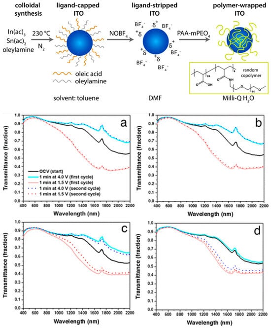 Aqueous processing and spray deposition of polymer-wrapped ITO NCs as EC thin films. Top: Illustration of the PAA-mPEO4 wrapping procedure of ITO NCs. Bottom: EC modulation of ITO films spray-coated onto FTO glass from ITO aqueous dispersion in: (a) pH 9.1 borate buffer (10% polymer by mass), (b) pH 8.5 borate buffer (18% polymer by mass), (c) pH 7.9 borate buffer (22% polymer by mass), and (d) pH 6.5 Milli-Q water (28% polymer by mass). Reproduced with permission from [203]. Copyright 2023, ACS.