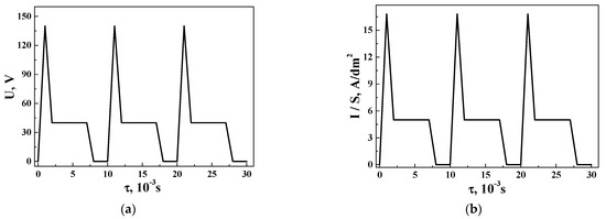 Change in the value of (a) voltage pulses U and (b) current density pulses I/S during the time τ of the anodizing process.