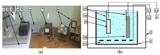 (a) General view of equipment for synthesis of pulsed hard anodized layers on surface of aluminum alloy samples; (b) and schematic representation of the cell for synthesis PHAL: 1—container with electrolyte; 2—chamber for stabilization of temperature regime of anodizing in range of −5–+10 °C; 3—bubbler; 4—electrolyte temperature control device; 5—ammeter; 6—power supply for maintaining current density of 5 A/dm2 between sample and electrode; 7—pulse frequency adjustment block; 8—voltage and pulse frequency control devices on sample; 9—sample for anodizing; 10—electrode; 11—bubbler; 12—compressor; 13—bubbler and compressor productivity control unit; 14—block for adjusting and controlling power of power source; 15—electrode and sample attachment; 16—anode layer.