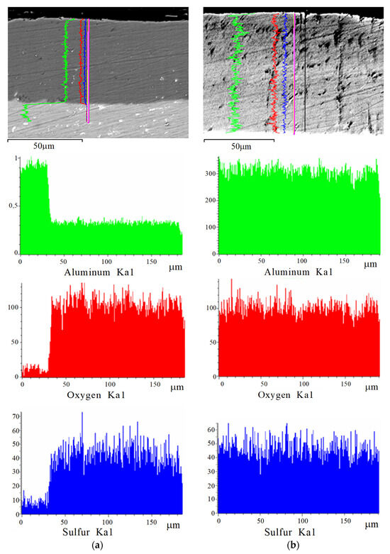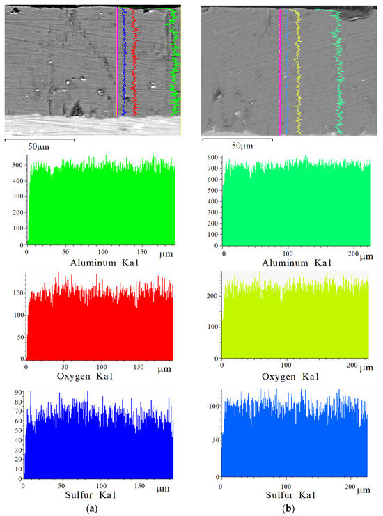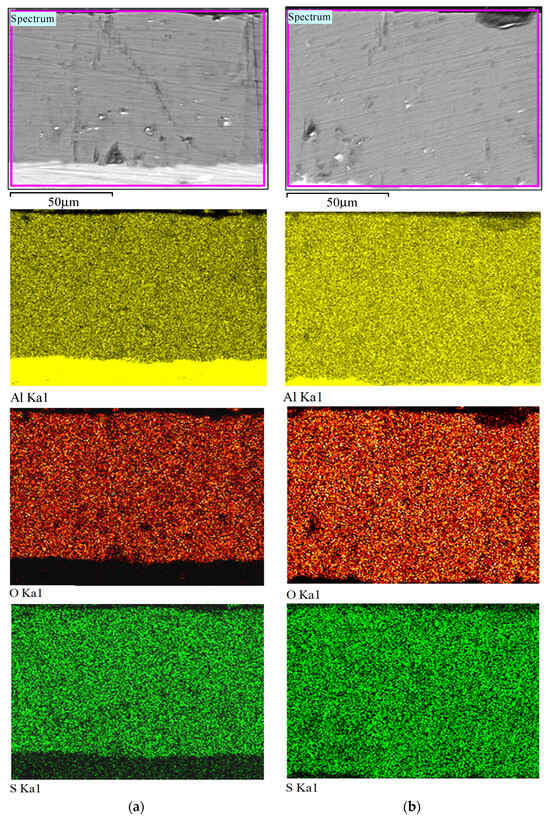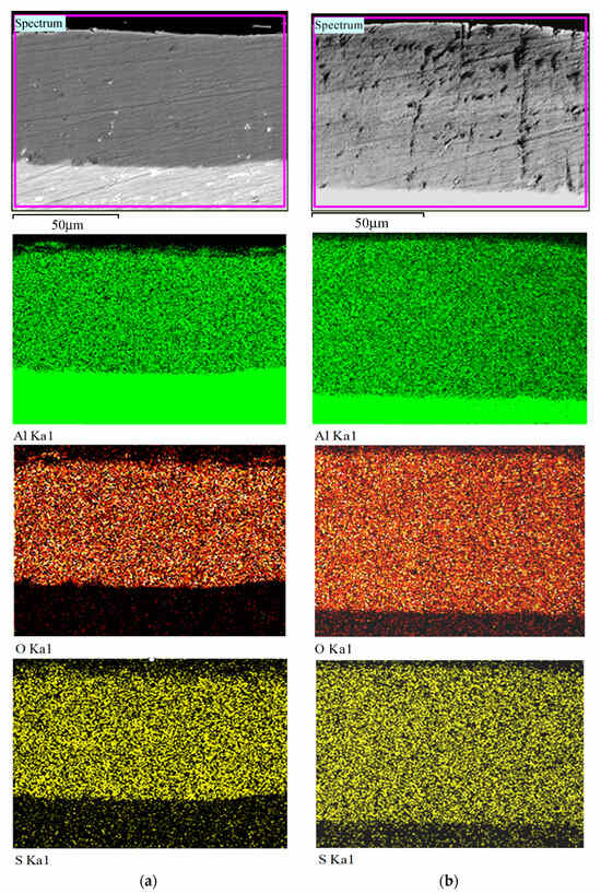 SEM cross-sectional micrographs and EDX elemental mapping of the anodized layers synthesized using direct (a) and pulsed (b) currents are shown in Figure 7. Their analysis confirmed the conclusion of the uniform distribution of all main elements (Al, O, S) in the structure of the anodized layers of both types (HAL and PHAL).