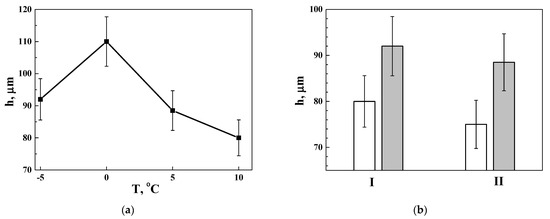 (a) Effect of the electrolyte temperature T on the thickness h of the synthesized PHAL for 1 h and (b) the thickness of the anodized layers h synthesized at temperatures of −5 °C (I) and +5 °C (II) under the action of a direct (white columns) or pulsed (grey bars) current.