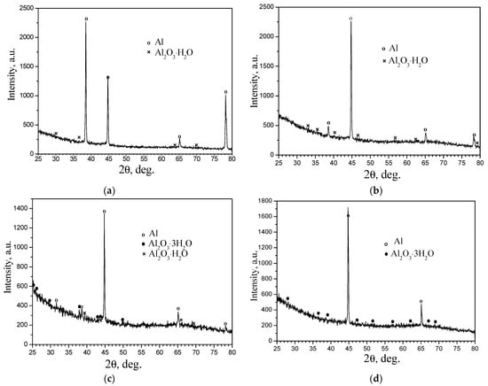 Figure 11 shows that hydrated aluminum oxides of two types were formed in anodized layers synthesized at different electrolyte temperatures: Al2O3·H2O with one water molecule and a boehmite structure (a = 3.694 Å, b = 12.214 Å, c = 2.868 Å [64]), and Al2O3·3H2O with three water molecules with a gibbsite structure (a = 8.684 Å, b = 5.078 Å, c = 9.736 Å [65]). In the diffraction spectra obtained on PHAL synthesized at temperatures of −5 °C (Figure 11a) and 0 °C (Figure 11b), only reflections of aluminum oxide with one water molecule (boehmite Al2O3·H2O) were recorded, while on PHAL synthesized at temperature of electrolyte +5 °C (Figure 11c), the reflections of two phases were identified—Al2O3·3H2O (gibbsite) and Al2O3·H2O (boehmite). Only one phase (gibbsite) was again recorded in the X-ray diffraction pattern of PHAL synthesized at a temperature of +10 °C (Figure 11d).