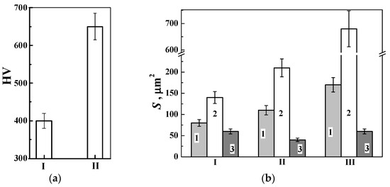 Comparison of friction wear values S of high-strength aluminum alloy 1050 (1) and anodized layers on the surface of aluminum alloy 1011 synthesized in sulfate electrolyte at a temperature of −5 °C for 1 h by hard anodizing at a current density of 3 A/dm2 (2) and by the method of pulsed hard anodizing (3). These data were obtained after tribological tests of the corresponding samples in contact with (a) steel and (b) ceramic balls during friction (I) without lubrication (in air), (II) in mineral lubricant I-20, and (III) in EDGE 5W-40 synthetic lubricant.