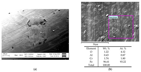 Comparison of the morphological features of the surfaces of both friction elements in the zone of their contact during tribological tests in I-20 mineral lubricant: (a) a ceramic ball with the corresponding data of X-ray microspectral analysis and (b) a pulsed hard anodized layer, synthesized at a temperature of +10 °C.
