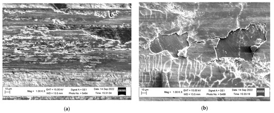 PHALs with the best and worst wear resistance were analyzed. They were synthesized on aluminum alloy 1011 at temperatures of −5 °C and +10 °C, respectively. Wear traces on the surfaces of synthesized PHALs after their tribocontact with a steel ball in an I-20 mineral lubricant medium are shown in Figure 18. Sufficiently deep wear marks in the form of clearly defined lines were found even at low resolution on the surface of the PHAL synthesized at a temperature of −5 °C (Figure 18a,b). Small burrs, ragged edges of wear tracks (which is also a sign of burrs), and signs of extrusion of metal along the wear tracks (due to plastic deformation) were often found at higher resolutions (Figure 18c). All these features are fractographic signs of the low wear resistance of the PHAL synthesized at a temperature of −5 °C. This result correlates with the results of mechanical testing of the tribocouple PHAL—steel ball (Figure 14a).