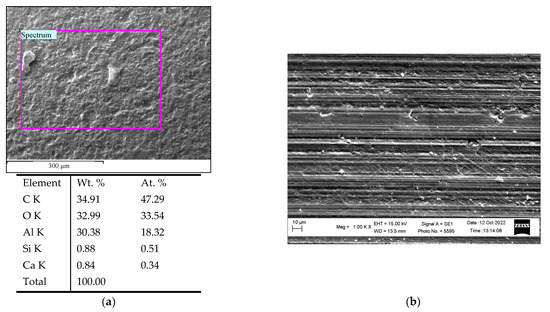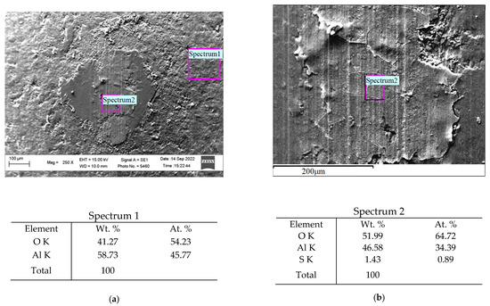 On the PHAL surface in the zone of contact of both elements with a higher resolution, smooth areas of the plastically deformed upper layer of gibbsite and areas after its peeling, where the inner gibbsite sublayer protruded outward, were observed (Figure 23b). This indicates weak adhesion between the layers of the gibbsite and low crack resistance of its upper layer, which cracks under the contact load. Both of these factors contributed to the separation of small areas of the PHAL surface from the inner sublayer, followed by the adhesion of gibbite particles to the surface of the ceramic ball. Similar wear patterns during friction tests of anodized layers were observed by other researchers [67,68]. The proposed mechanism of PHAL wear is also confirmed by the results of X-ray microspectral analysis of the surface layer on the ceramic ball after its contact in air with PHAL, synthesized at a temperature of +10 °C (Figure 24). The ceramic ball consisted of corundum (Al2O3), as evidenced by the spectrum in Figure 24a. The presence of sulfur on the contact surface of this ball with the PHAL layer (spectrum in Figure 24b) indicates the transfer of the surface layer of PHAL and its adhesion to the ceramic surface.