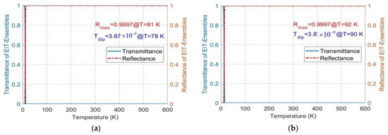 The optimal temperature for applying coatings is contingent upon the specific type of coating being used. Generally, coatings should be applied in favorable weather conditions, when the air and surface temperatures are between 50 °F (10 °C) and 125 °F (50 °C) [33], for most paints. In Table 1, it is shown that under the conditions , , and , the reflectance data are very close to 1, and the transmittance data are very small, i.e., approaching 0 (e.g., at an order of magnitude of and ). Such data do not have practical significance: i.e., they are understood only in the sense of a model. With these very small ranges, discriminating the corresponding temperature is difficult. When the conditions , , and are met, both the reflectance and transmittance can be easily distinguished, with values of 0.565782 and 0.557437, respectively, covering operating temperatures of 283 K to 323 K. In contrast, when the set of conditions , , and are met, the reflectance and transmittance are difficult to distinguish at each corresponding temperature, with values of 0.02948 and 0.03206, respectively, leading to difficulties in resolving the operating temperature between 283 K and 323 K.