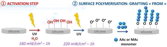 The method consists of growing polymer chains from radical species present on the silicone surface. In the first step of the grafting, the silicone sample is exposed to UV irradiation aims to make the initially inert surface reactive. Activation under UV irradiation in water will act on the methyl bonds (Si-CH3) of the PDMS present at 785 cm−1 on the FTIR spectra (Figure 2). The irradiation will break homolytically the CH2-H bonds to create hydroxyl (-OH) groups on the surface (Figure 1—Step 1). The formation of these groups on the surface can be justified by the presence of ether bonds (C-O-C) on the FTIR spectra at 1162 cm−1 (Figure 2) formed after the polymerization step (Step 2) between the activated surface and the polymer.