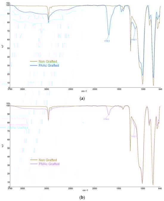 FTIR spectra of (a) Non-grafted silicone and PAAc grafted silicone; (b) Non-grafted silicone and PMAc grafted silicone.