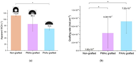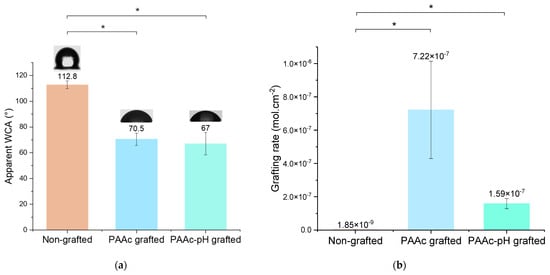 (a) Apparent Water Contact Angle (WCA) of non-grafted, PAAc grafted and PAAc-pH grafted silicone (* p = 0.05); (b) Grafting rates of non-grafted, PAAc grafted and PAAc-pH grafted silicone (* p = 0.05).