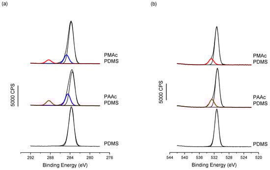 XPS High-Resolution spectra for (a) C1s and (b) O1s, showing for both PAAc and PMAc the appearance of characteristic features linked to the acrylic moieties, compared to the bare PDMS.
