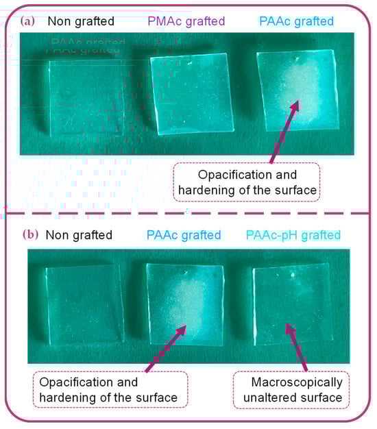 TB assays allow us to complete the chemical characterization by evaluating the grafting rates of each bioactive polymer on surfaces. The results presented in Figure 3b show high grafting rates for each condition in comparison to the non-grafted silicone. One can observe that non-grafted silicone already presents a grafting rate. This is due to the non-specific adhesion of TB on the material. Thus, grafted surfaces must be compared to a control sample to assess whether the grafting rate is notable. Both bioactive polymers have a particularly high rate due to the high reactivity of the monomer and the possible penetration of the polymer into the PDMS matrix [10,37,38]. However, the PMAc-grafted silicone grafting rate shows a high standard deviation. The high reactivity of the monomer and the difficult control of an experiment involving a much more diffusive UV beam could be responsible for the unrepetitive results. Moreover, the wettability results do not always agree with the graft rate values for PMAc grafting. For a given sample, a low apparent contact angle may correspond to a high grafting rate and vice versa. The grafting technique does not allow control over the size of the polymer chains formed on the surface. The high reactivity of PMAc can thus generate long chains of polymer forming a layer on the surface. In this way, the sample, once dried can bring surface irregularities which could explain the low apparent contact angle measurements on a surface associated with a high rate of grafting. Moreover, as observed by Velazco et al. [38] and Yang et al. [37] the polymer could penetrate the silicone matrix and graft inside, limiting surface effects. This hypothesis would explain the change in appearance observed macroscopically on our silicone samples (Figure 5a) and justify the high grafting rate obtained for both polymers. After grafting, the silicone appears hardened and more opaque. The mechanical results discussed later in this study may support these hypotheses. Additional studies on the behavior of the polymer on the surface must be carried out to clarify these variations.