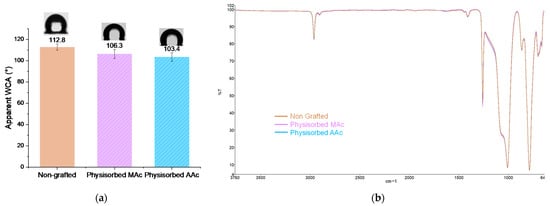 (a) Apparent WCA of physisorbed polymers; (b) FTIR spectra of non-grafted silicone and physisorbed polymers on silicone surface.