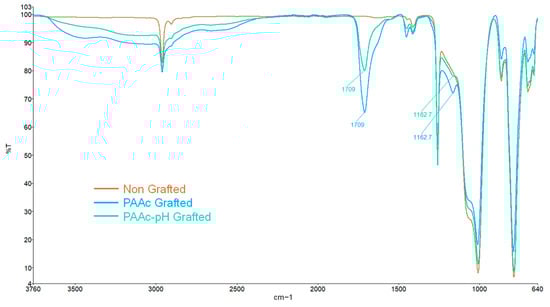 Due to the uncertain and unrepeatable results of the PMAc grafting, the study chose to only focus on the grafting of the PAAc under new pH adjustment conditions (PAAc-pH). Also, the assays of MAc grafting in the basic medium being inefficient, the condition was not retained for this study.