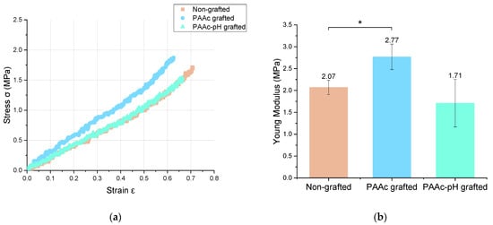 (a) Stress = f (Strain) curve and (b) Young Modulus of non-grafted, PAAc grafted and PAAc-pH grafted silicone samples (* p = 0.05).