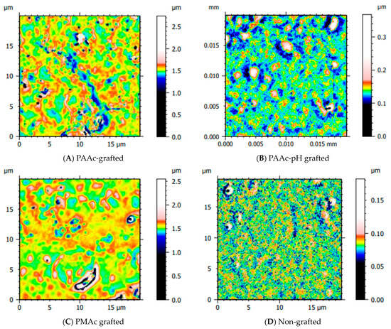 Several topographic images were taken on our grafted samples (Figure 11). These acquisitions aim to obtain more information on the behavior of the polymer once grafted on the surface. Figure 11 has been drawn using a color palette optimized for each surface, to better visualize the appearance of the surface rather than its relative height. Yang et al. [37] showed that when PAAc is grafted on PDMS films, the monomers can penetrate and polymerize in the PDMS network, making the material rigid and even brittle. Cracks that appear on the surface offer new interfaces for grafting to other monomers still present in the solution. We have observed this effect with our strategy of direct grafting of the PAAc on the surface. Later, this effect was limited by the presence of COO− anionic groups during PAAc-pH grafting which generates chain-chain repulsions and silicone surface-chain repulsions [38]. In Figure 11A,C, representing direct grafting of AAc and MAc, the images expose the high reactivity of the polymers and their invasion on the material compared to the surface of non-grafted silicone Figure 11D. Globally, we can highlight the fact that the polymer is present homogeneously on all surfaces. For PAAc-pH grafting (Figure 11B), the polymer behavior seems close to an ungrafted surface. The level of polymers present on the surface seems to be lower. These results correlate with the grafting rate level which appears lower than for a PAAc grafting, but still higher than a non-grafted PDMS (Figure 8b), and with the tensile strength tests where the PAAc-pH samples curve and the Young’s Modulus were close to a non-grafted PDMS sample (Figure 10). Actually, there are probably less grafted PAAc on the PAAc-pH grafted samples than for PAAc grafted samples because the grafting occurs mainly on the surface for PAAc-pH. These results remain qualitative, we can also hypothesize that because direct PAAc grafting is reactive it generates many long chains of polymers, while grafting in a basic medium (PAAc-pH) allows the grafting of possibly shorter distributed chains. Now further investigations especially biological assays must complete the study in order to evaluate the efficiency and the effect of the grafting.